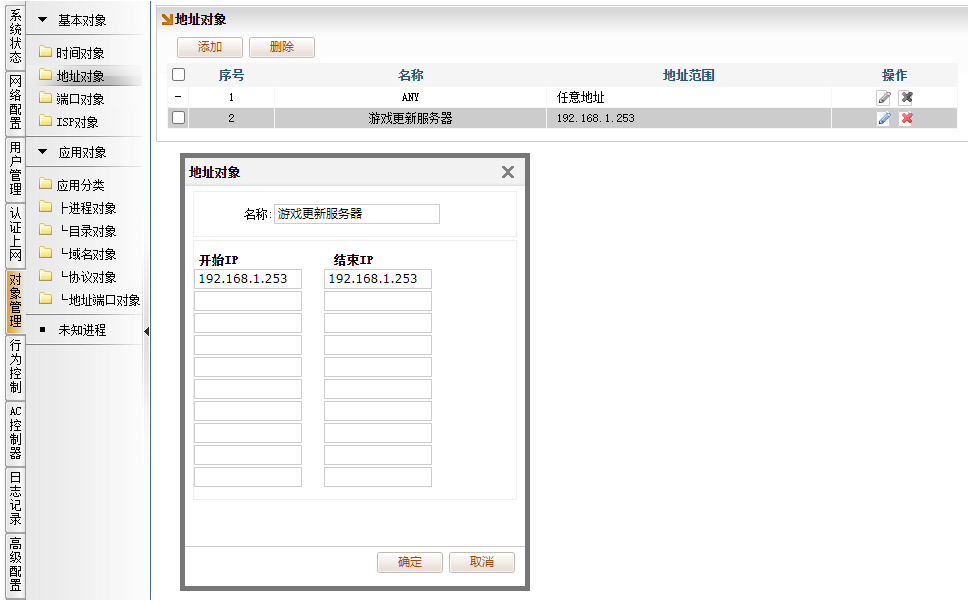 [对象管理]→[地址对象],点“添加”。命名名称,填入IP,如下图所示