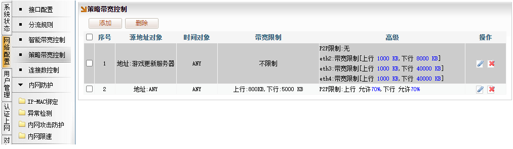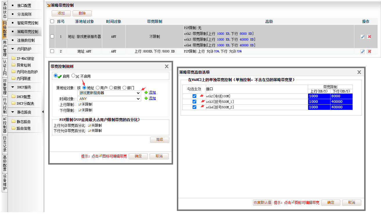 [网络配置]→[策略带宽控制],点“添加”。地址选择“游戏更新服务器”,点击“高级”,勾选生效开关,填入游戏更新服务器,在每个线路上单独限速的上下行带宽。
