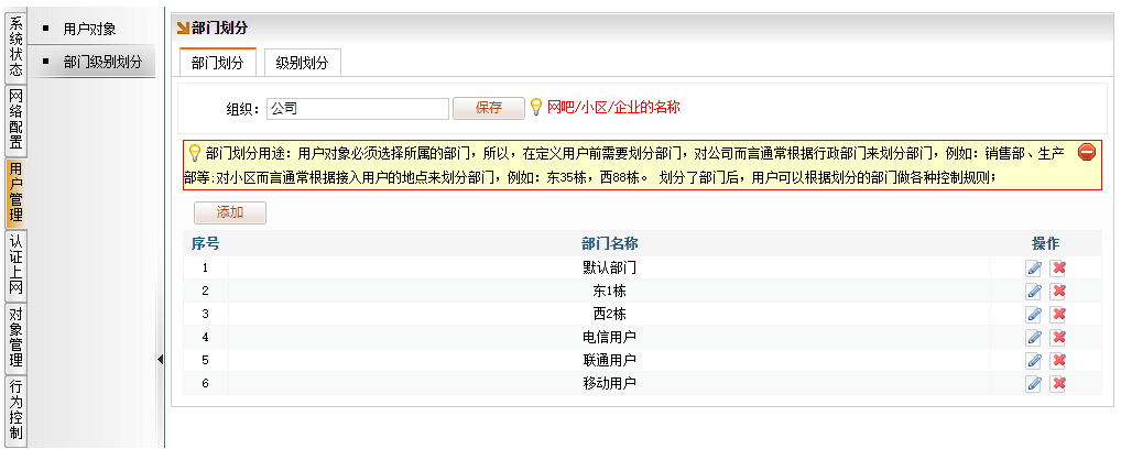 Ø 按接入用户所在地点来划分部门,例如:东1栋,西2栋。