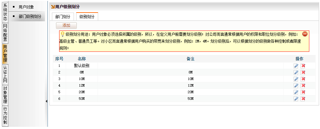 划分级别——用于关联限速规则。为用户关联不同的套餐类型。例如:8M、10M、12M、20M、50M等。