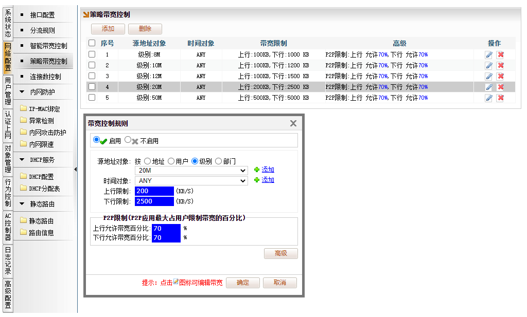 [网络配置]→[策略带宽控制],添加限速策略,选择“源地址对象”为“级别”,分别配置8M、10M、12M、20M、50M对每个级别限速。比如: