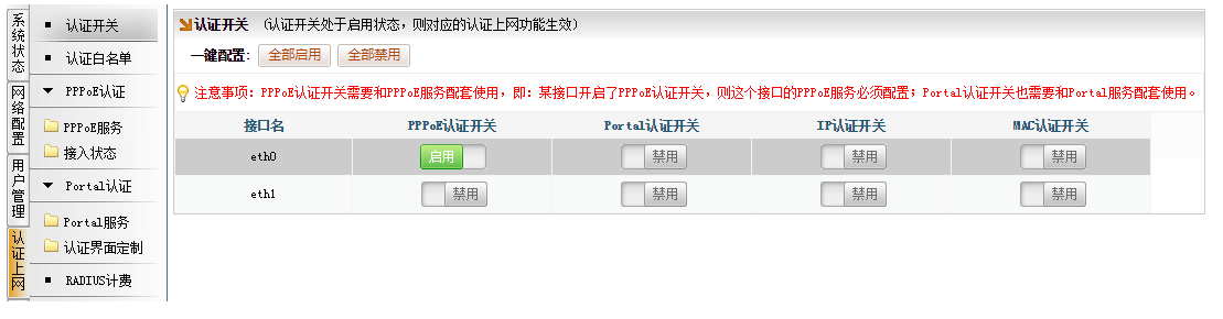 注意:必须开启认证,如果不开启认证,有用户知晓路由的LAN口IP,可能存在直接配置IP地址直接上网的可能;其次,需要开启认证,对已经过期的用户拦截上网。