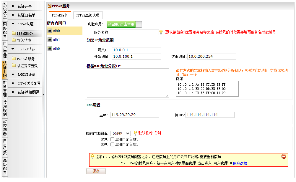 [用户管理]→[PPPoE服务]→[接入配置],选择 eth0,修改主 DNS和辅 DNS 为当地的 DNS,点保存