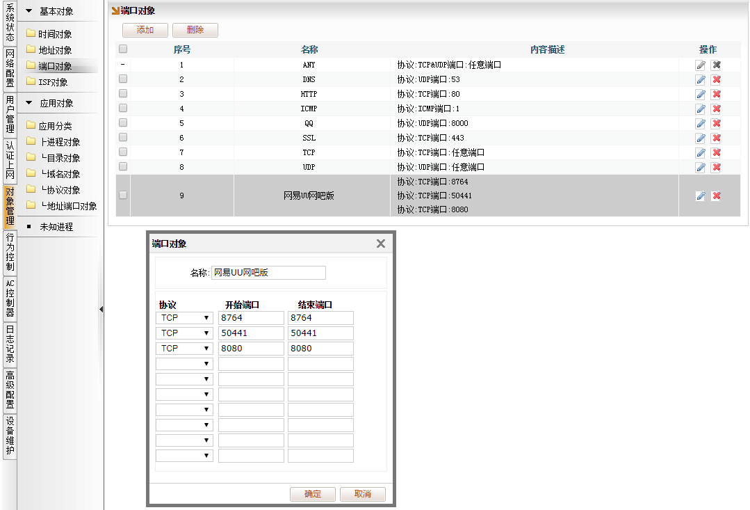 1、[对象管理]→[基本对象]→[端口对象],添加,名称比如为“网易UU网吧版”,填入3组网易UU的TCP端口 TCP 8764 ; TCP 50441 ; TCP 8080 ,点确定