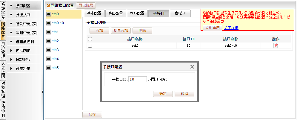 [网络配置]→[接口配置],比如选择eth0口,“子接口”一栏,添加子接口ID(填入数字范围是1~4096任意数字),为了便于标识,比如填入数值10,点击“确定”。