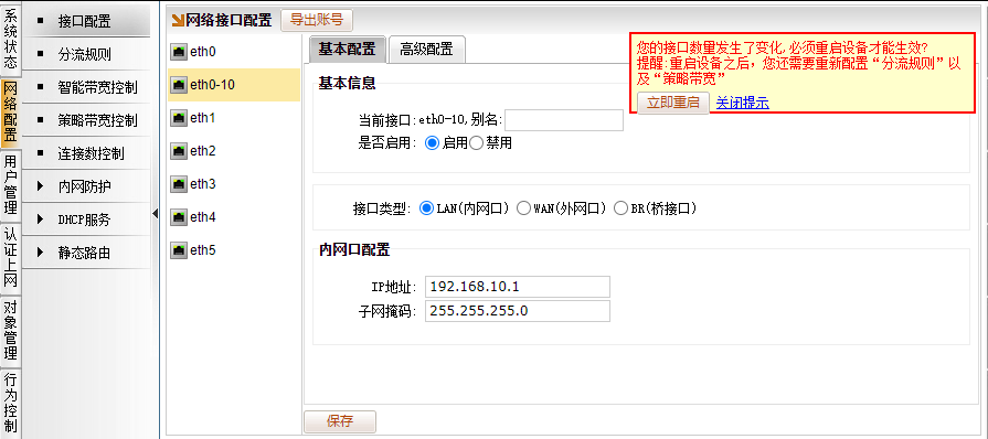 完成子接口ID的添加后,左边栏会生成出“eth0-10”的子接口。选择eth0-10的子接口,配置接口类型:LAN(内网口),填入IP信息,保存后,重启路由。
