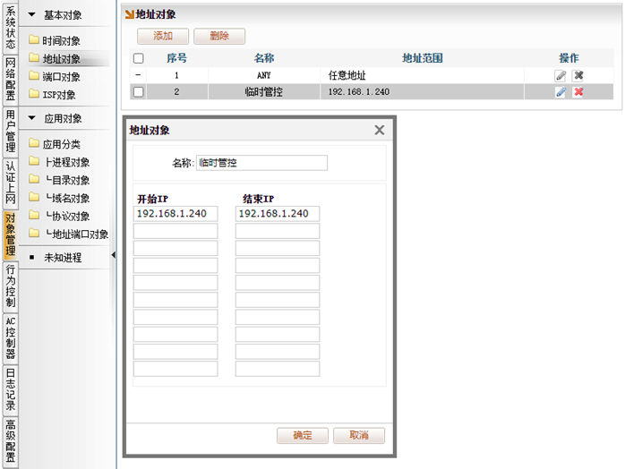 [对象管理]→[基本对象]→[地址对象],添加地址对象,比如命名为“临时管控”,填入需要被管控的IP/IP段。比如下图定义了临时管控的地址对象为192.168.1.240。