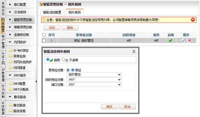 [网络配置]→[智能带宽控制]→[例外规则],添加智能流控例外规则,源地址对象,选择“地址-临时管控”,点击确定。