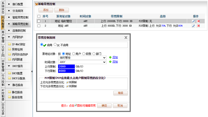 [网络配置]→[策略带宽控制],添加带宽控制规则,源地址对象,选择“地址-临时管控”,填入要限速的上行,下行带宽。比如下图限速该临时管控的IP上行带宽不超过2000KB;下行不超过8000KB。