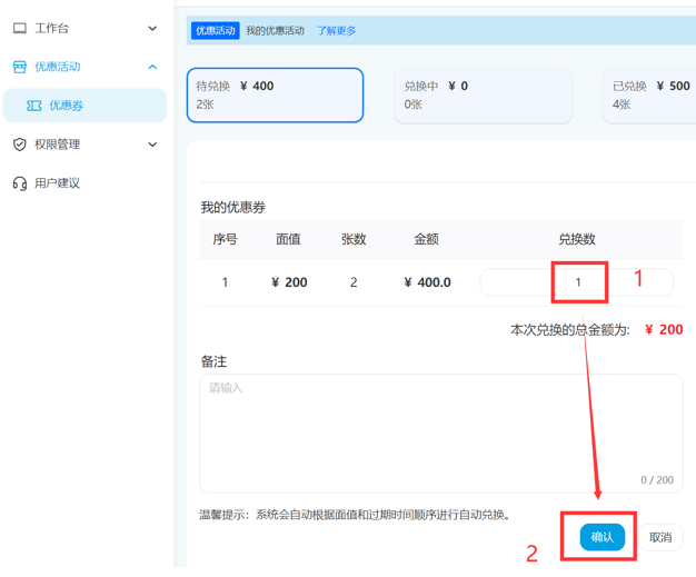 2、在“兑换数”框内,输入要兑换的优惠券数量,点击确认提交