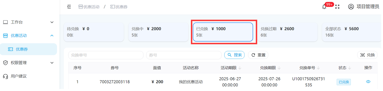 4、兑换申请通过的优惠券,会进入“已兑换”页面,状态为:已兑换