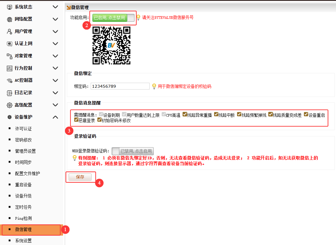 1、设备维护-微信管理-开启开关-保存