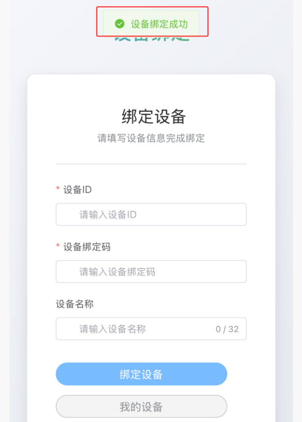 信息填写完后,点击-绑定设备,会提示-设备绑定成功