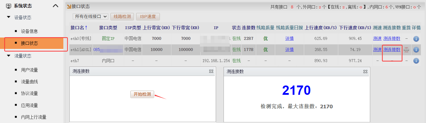 系统状态 → 接口状态 → 测连接数 → 开始检测