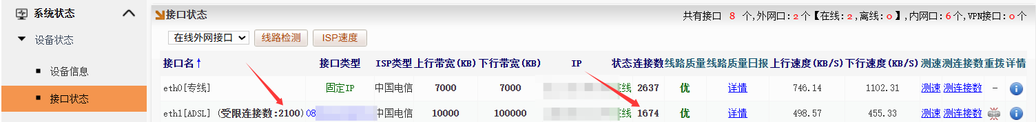 3、在接口状态中可以看到,该线路的受限连接数已显示为 2100。这表示当右侧状态中显示的当前连接数达到 2100 左右时,新的网络连接将不再分配至该线路,而是根据分流规则,自动切换至连接数尚未饱和的其它线路进行转发。