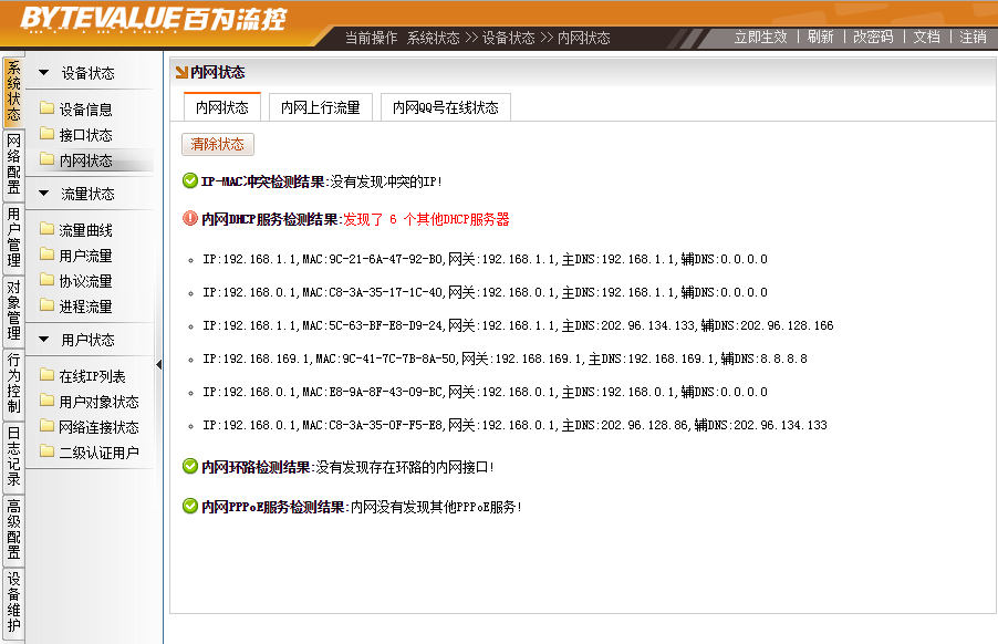 内网其他DHCP服务,路由是无法对其干涉的。百为路由提供DHCP检测功能,作用在于方便用户定位内网问题。虽然无线路由的DHCP服务不会对百为路由有什么影响,但对于小区有如下风险: