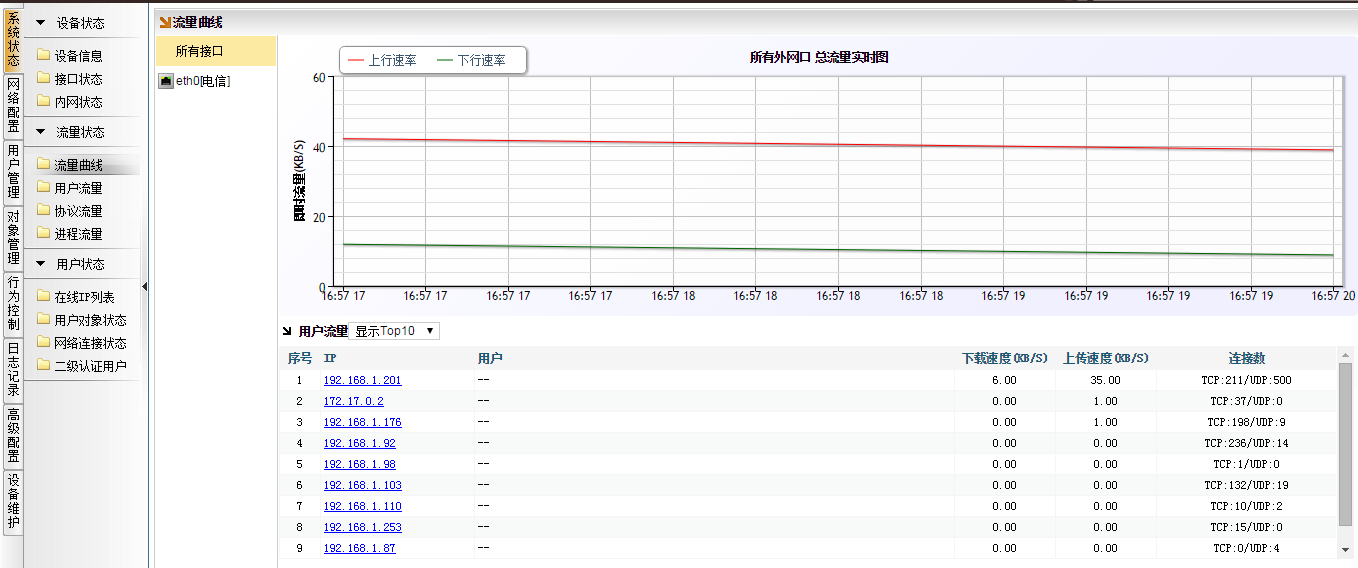 而[系统状态]→[流量曲线],看到的统计后的流量较小,内网也并没有什么下载流量