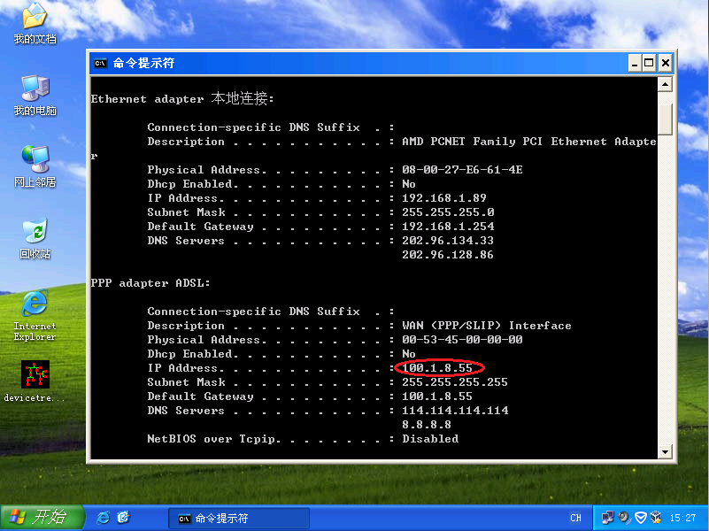 拨号成功,一开始能上网的时候,在命令行窗口,输入 ipconfig /all,能看到正常分配的IP信息如下