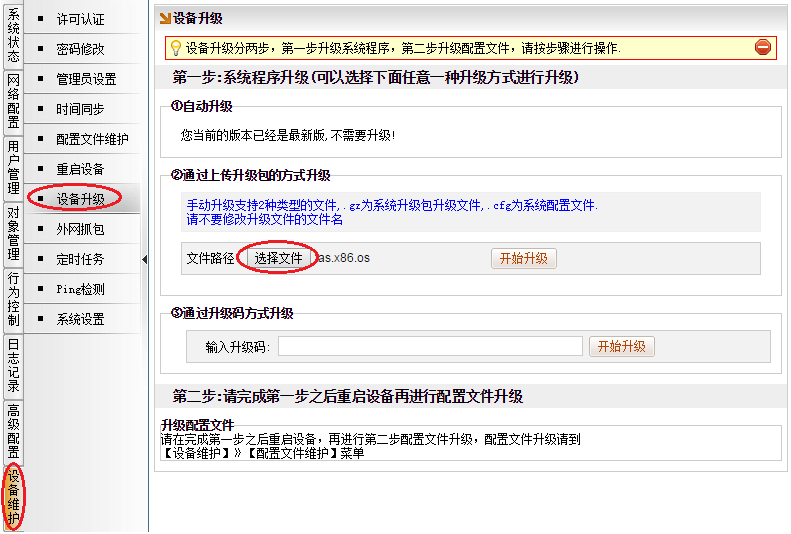 在路由的升级界面[设备维护]→[设备升级]→[通过上传升级包的方式升级],依次导入两个升级包,导入没有顺序之分。