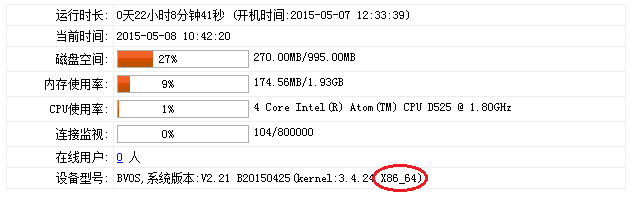 重启后 [系统状态]→[设备信息],查看设备型号一栏,如看到“X86_64”的字样,说明已经升级为64位的