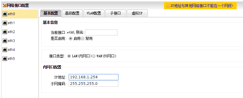 由于每个网口是独立的,所以内网网口之间,以及内网网口和外网网口,IP不能在同一个网段。比如,想把eth0,修改IP为“192.168.1.254”,掩码为“255.255.255.0”。修改之前,需要把eth1的网口,修改为别的网段,则不能使用192.168.1.1。比比如先修改eth1的IP为“172.16.1.1”掩码为“255.255.255.0”。修改后才可以再把eth0修改为1网段的IP。