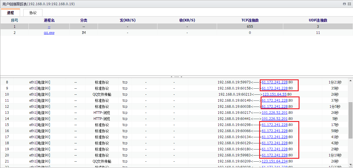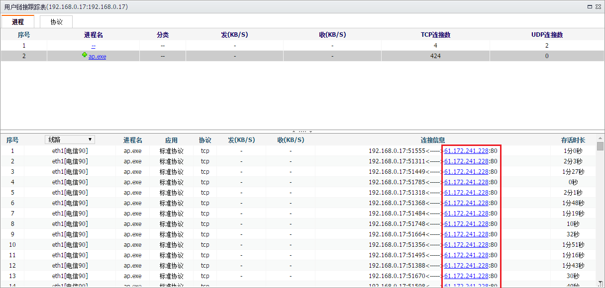 使用链接跟踪表,发现网吧的客户机,每台机器都在不停的访问同一个IP地址:61.172.241.228