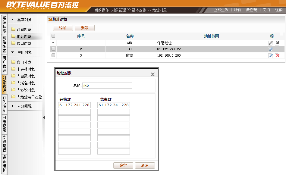 1、[对象管理]→[地址对象],添加IP地址,比如名称命名为“ikb”,IP地址填写“61.172.241.228”