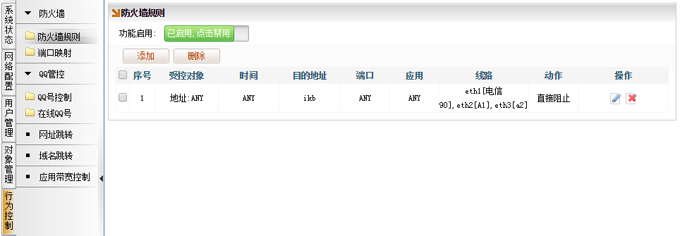 [行为管理]→[防火墙规则],添加防火墙规则,“受控对象、时间、端口,应用”选择为“ANY”,“目的地址”选择为“ikb”,勾选所有WAN口,动作为“直接阻止”