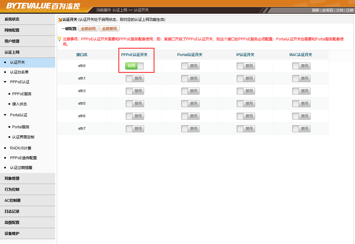 1、需要启用认证上网,选中上网人员所在的内网口,比如eth0,[认证上网]→[认证开关],选中对应的内网口,启用认证开关,勾选上网的类型,比如小区上网类型是“PPPoE认证开关”,则打开“PPPoE认证开关”。