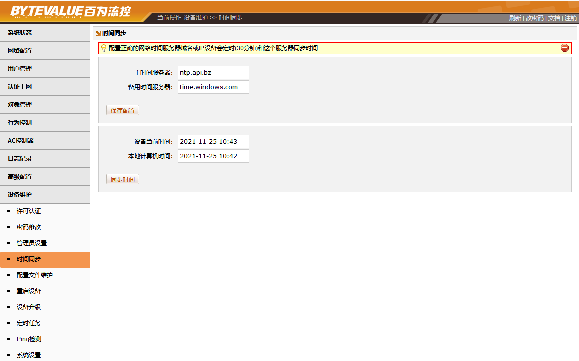如果时间不正确,点击[设备维护]→[时间同步],点击同步时间,可把当前电脑的时间,同步到路由去。