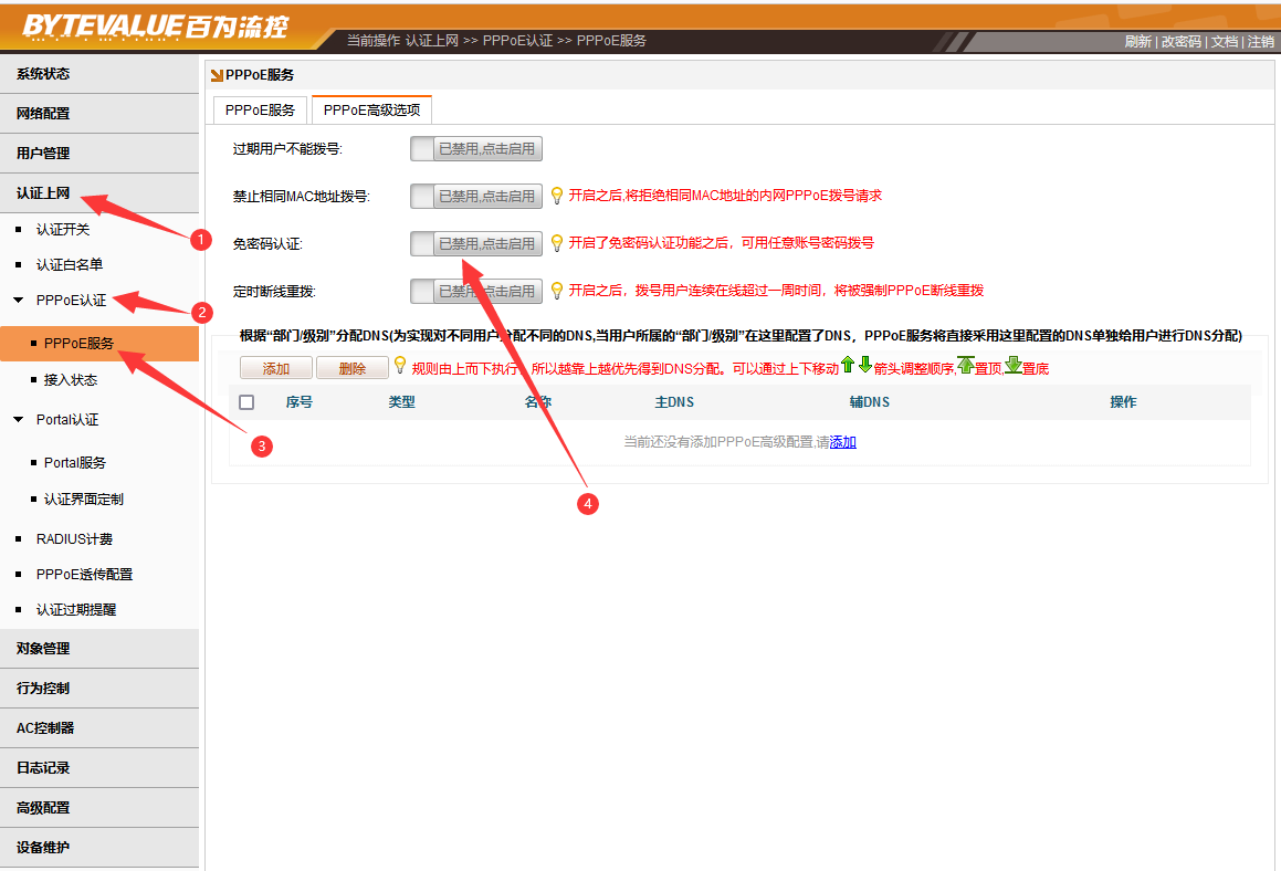2、关闭“免密码认证”的开关。免密码认证,是提供给小区应急使用,比如小区的路由的磁盘损毁,用户数据丢失,需要临时启用免密码认证,让用户拨号上来直接使用