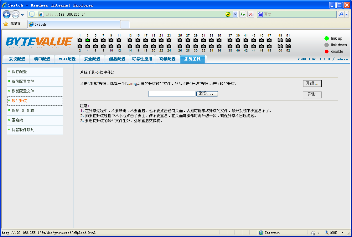图1是软件升级页面,通过此页面用户可以上传映像文件到交换机。点击浏览按钮选择上传的映像文件在PC上的目录路径。点击上传按钮上传映像文件,必须是由厂家提供的并且文件名后缀必须是*.img。